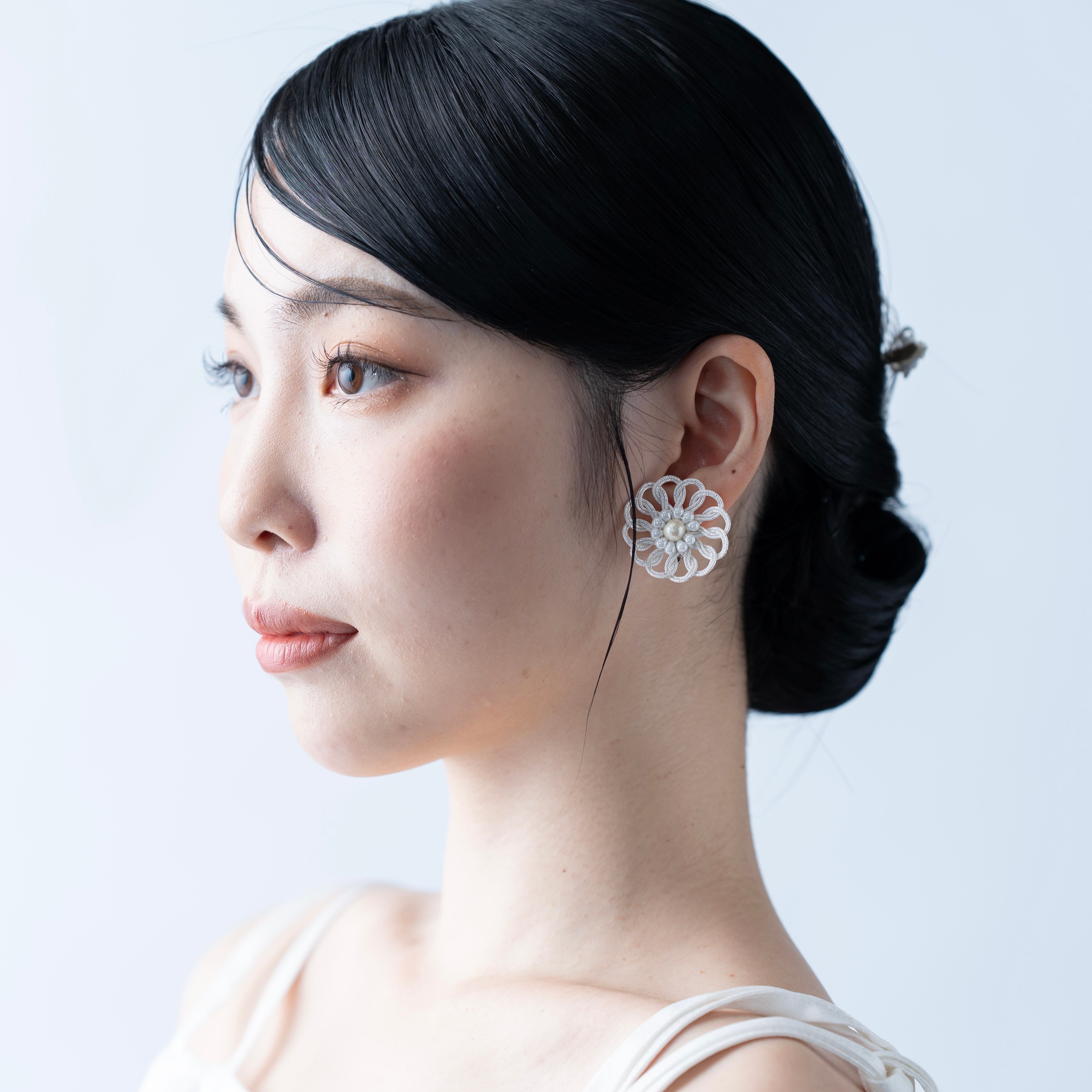 イヤリング「キク」は、伝統的な菊文様を現代的なデザインにしたアイテムです。水引にパールを用いており、シンプルながらも華やかであり、幅広いシーンで楽しむことができるアクセサリーです。