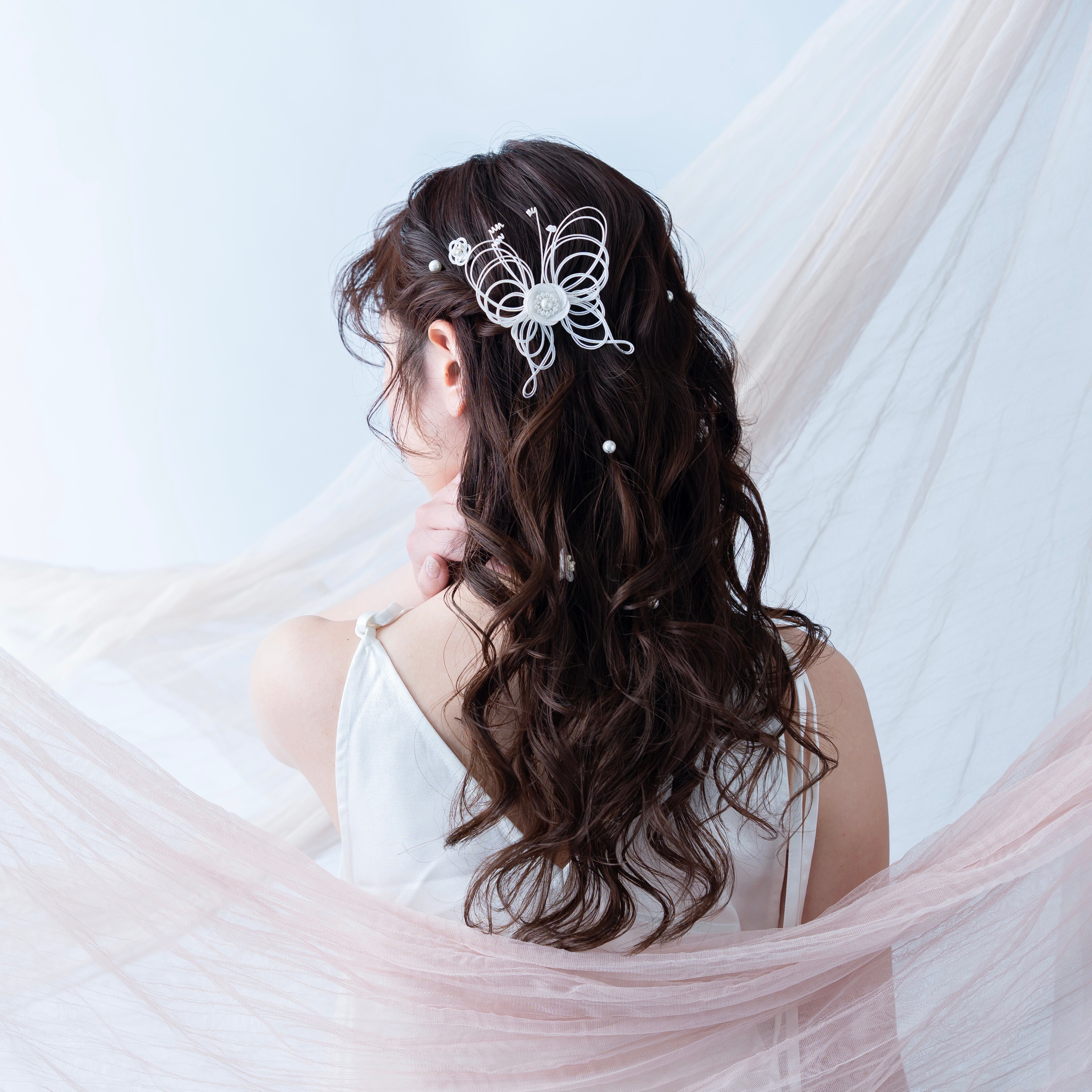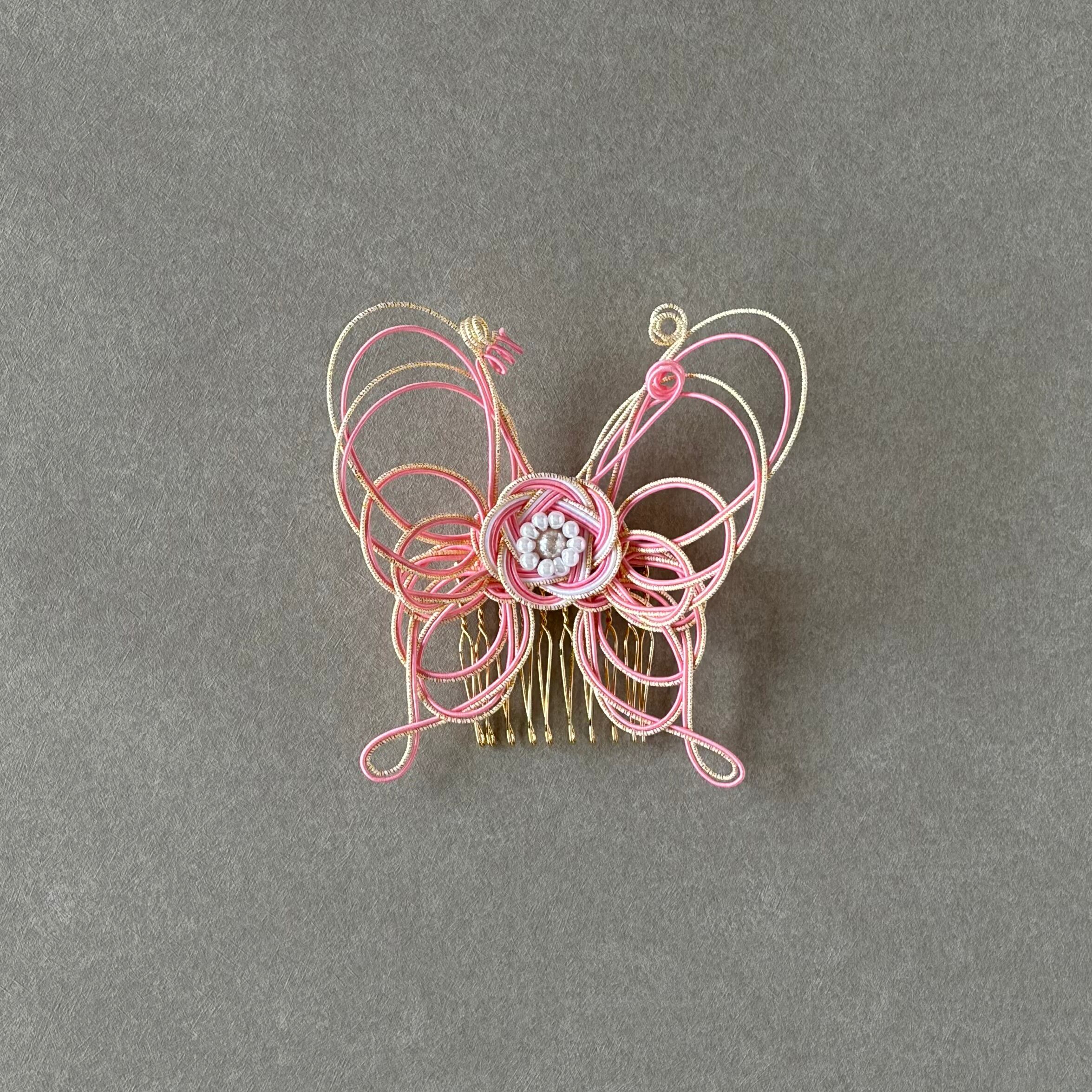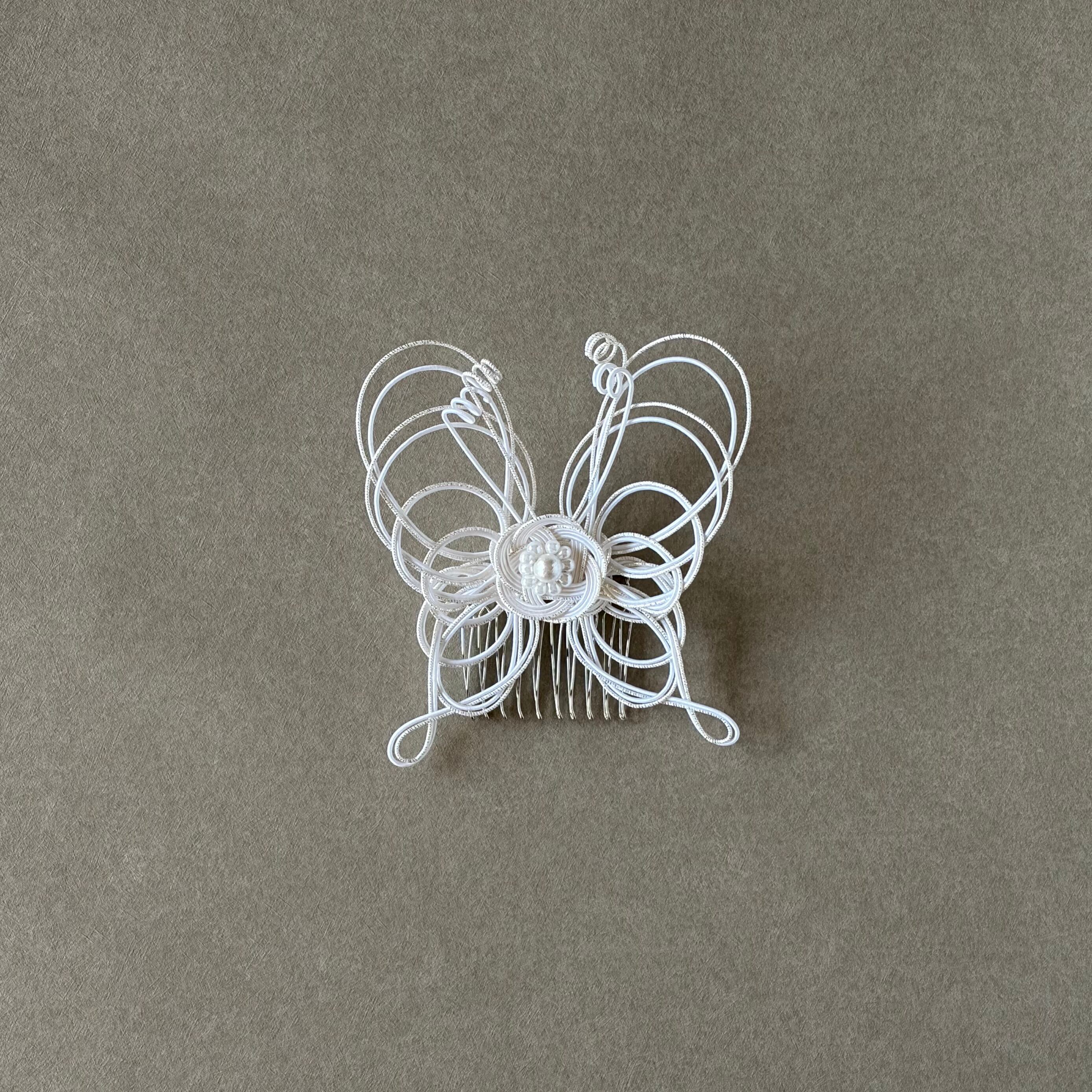 ヘアコーム「チョウ」は、繊細で優雅な水引の特性を活かして、宙に舞い踊る蝶を表し、存在感を放つアイテムとなっています。お子様から大人の方まで、ドレスに着物にと華やかさを添える一品です。